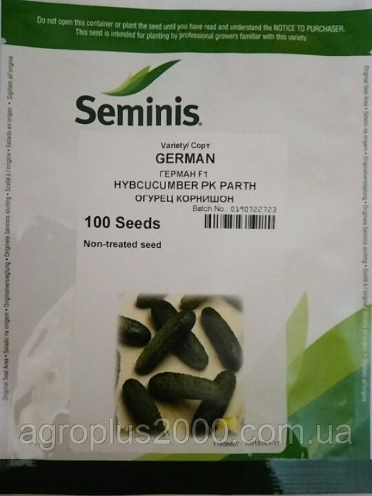 Герман F1 - має дуже високий потенціал раннього врожаю. Гібрид сильнорослий яскраво вираженого генеративного типу. Плоди привабливого зеленого кольору і форми, довжина 9-11 см, однорідні за формою і за розміром. Хороша консистенція плодів дозволяє отримати гарний засол - огірочки хрусткі та смачні. Плоди гарантовано без гіркоти. Гібрид рекомендується вирощувати у всіх видах теплиць для отримання раннього врожаю корнішонів і у відкритому ґрунті.